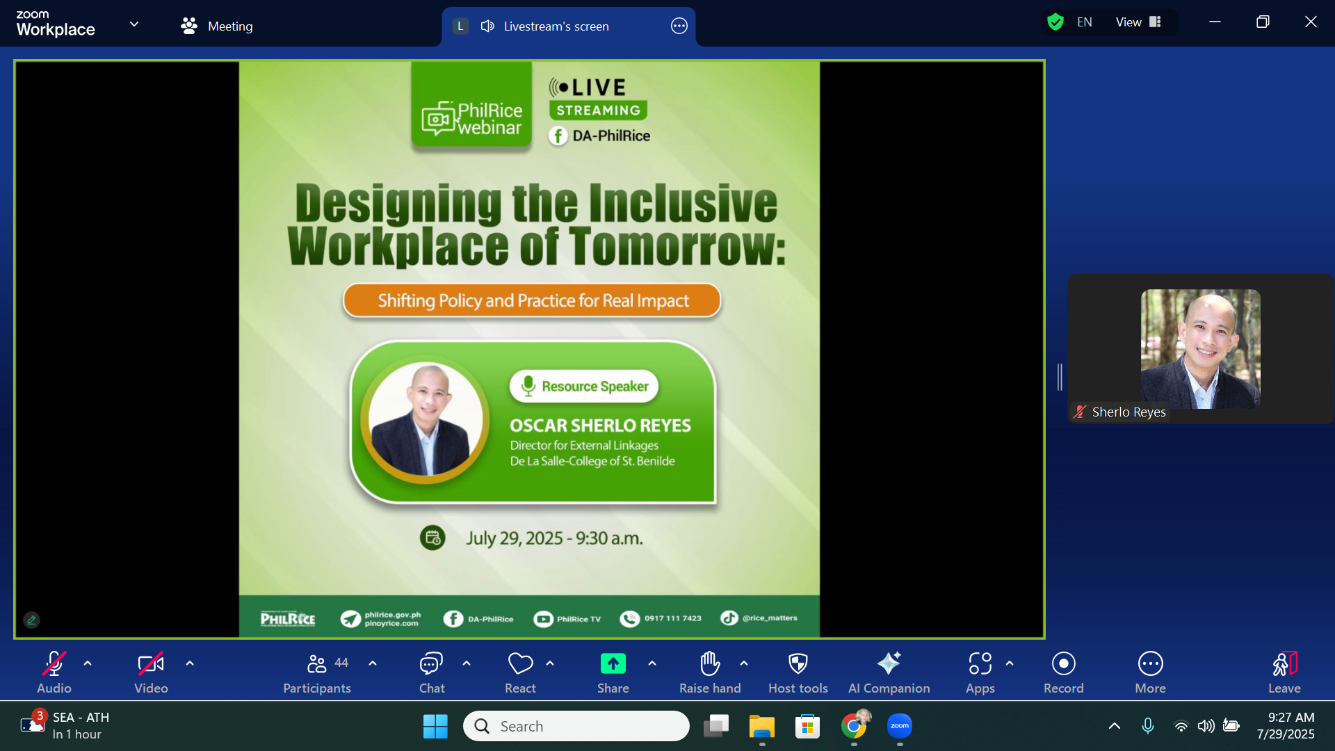 In a continued effort to promote equity and belonging in professional spaces, Sherlo Reyes delivered an insightful talk on “Designing an Inclusive Workplace” to the associates of the Philippine Rice Research Institute (PhilRice) on July 29, 2025.