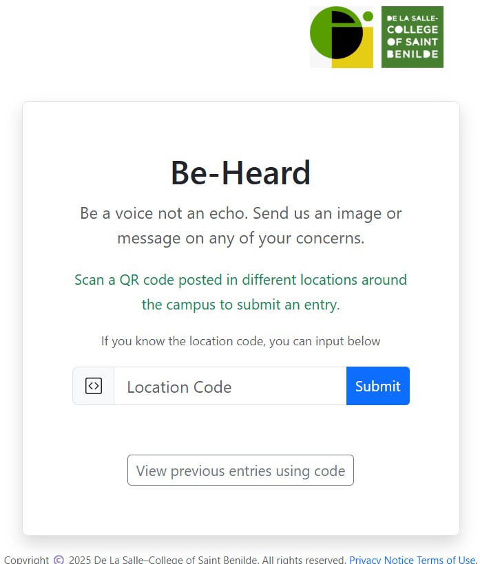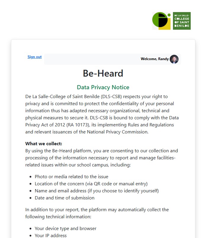 BE HEARD is a platform designed to provide the Benildean community—students and associates alike—with a streamlined avenue for submitting feedback, reports, or survey responses. Whether addressing routine concerns or urgent incidents requiring immediate attention, it empowers users to communicate swiftly and effectively.