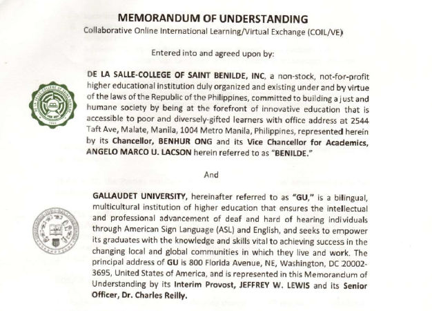 De La Salle–College of Saint Benilde and Gallaudet University formalized an agreement to jointly promote and develop activities centered on Collaborative Online International Learning (COIL)—a student-focused initiative integrated into academic courses to encourage cross-cultural exchange of knowledge. Under the Memorandum of Understanding (MOU), both institutions may also pursue collaboration in teaching, research, and other academic activities, including Deaf student and staff mobility programs and other initiatives of mutual benefit.