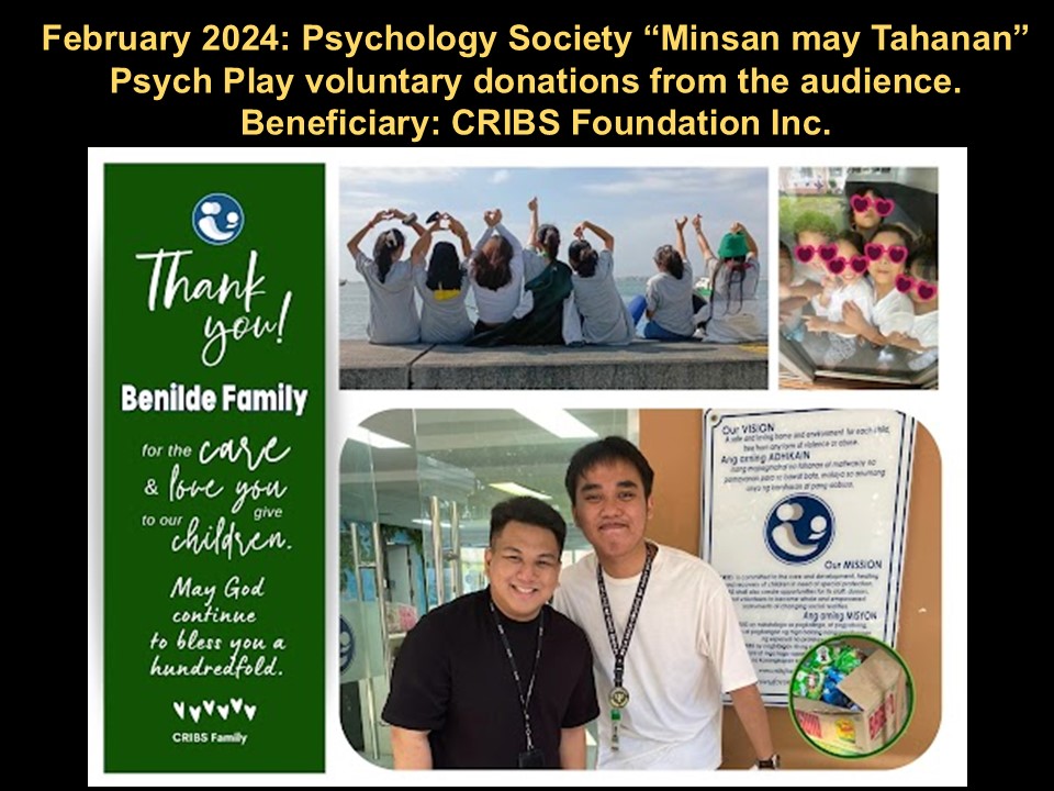 The De La Salle-College of Saint Benilde Antipolo Psychology Society captivated audiences with its powerful Psych Play, “Minsan May Tahanan,” staged last February 26, 2024. More than just a theatrical performance, the play served as a profound exploration of psychological themes—ranging from self-identity and peer pressure to family dynamics and ambition—aiming to foster empathy, spark dialogue, and promote mental health awareness among students. With free admission and a donation box at the venue, the event also championed community outreach, raising contributions for Cribs Foundation, Inc., a partner organization of Benilde Antipolo. This initiative reflects the Organization’s dedication to nurturing psychological well-being, creative expression, and a resilient, inclusive campus culture.