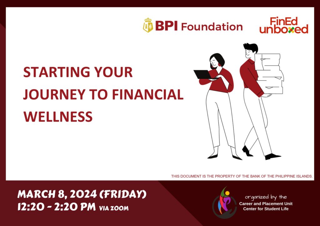 The Career and Placement Unit (CPU) of the Center for Student Life, in partnership with BPI Foundation, conducted the webinar “Starting Your Journey to Financial Wellness” on March 8, 2024 via Zoom. The session introduced students to the fundamentals of financial literacy through the BPI Foundation’s FinEd Unboxed program.