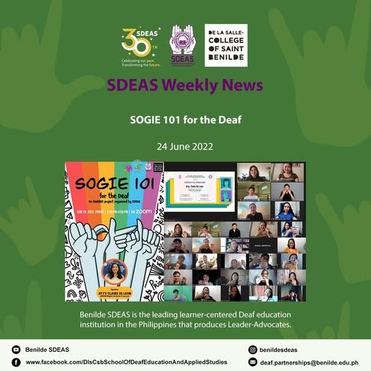 Conducted in collaboration with Pinoy Deaf Rainbow and facilitated by Atty. Claire De Leon, this webinar introduced SOGIE concepts and their connection to human rights. With full sign language interpretation, the session fostered understanding of gender diversity and inclusion within the Deaf community, reinforcing the importance of respect and equality for all gender identities. June 24, 2022.
