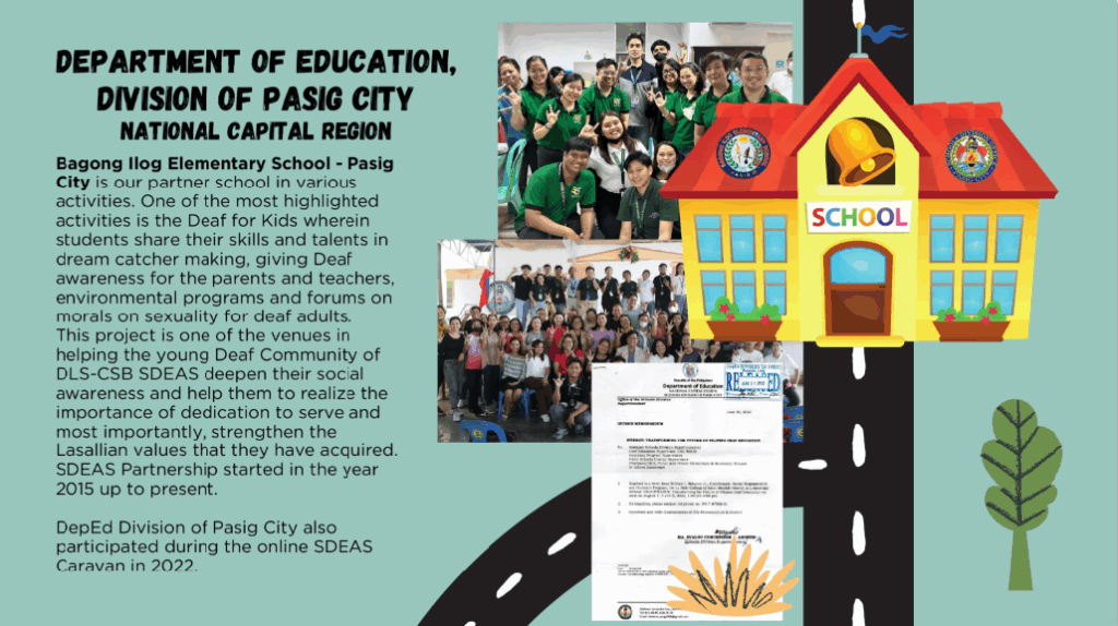 Our partner school wherein SDEAS Volunteers personally are involved and immersed in the community to have a concrete perspective and understanding of the true spirit of Lasallian-Benildean Identity. It aims to promote to students social awareness and help them realize the significance of extending helpful actions (volunteerism) towards others especially to the less fortunate brothers and sisters by conducting hands-on activities (i.e. Workshops, Seminars, Feeding program and other related activities that would benefit Deaf students. Also includes the co-curricular and extra-curricular activities (NSTP-02, DESTUIN and Community Engagement ) volunteer work and opportunities that are mutually and empowering and beneficial.
