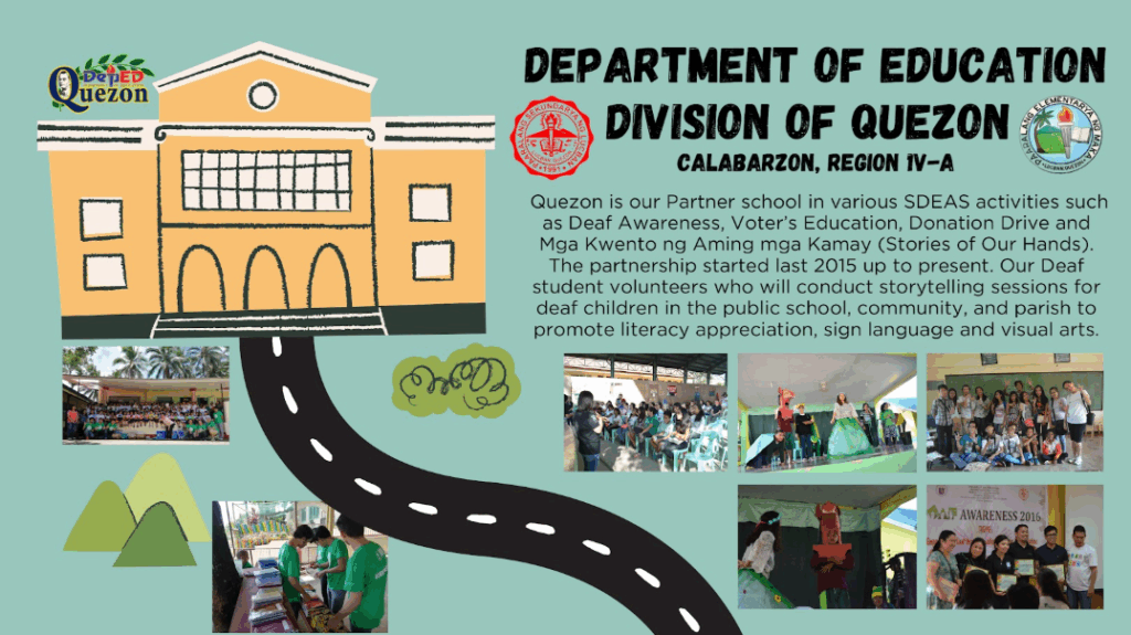 Quezon is our Partner school in various SDEAS activities such as Deaf Awareness, Voter’s Education, Donation Drive and Mga Kwento ng Aming mga Kamay (Stories of Our Hands). The partnership started last 2015 up to present. Our Deaf student volunteers who will conduct storytelling sessions for deaf children in the public school, community, and parish to promote literacy appreciation, sign language and visual arts.
