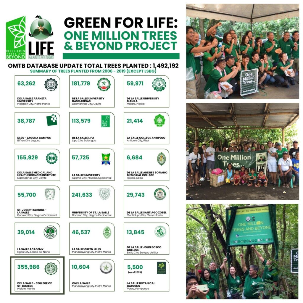 Launched in 2006 by the Lasallian Institute for the Environment (LIFE) under De La Salle Philippines, the One Million Trees and Beyond (OMTB) Program mobilized Lasallian schools nationwide to plant and nurture trees in support of environmental sustainability. While the initial goal of one million trees was reached, the initiative continues today through ongoing reforestation and tree-growing activities across the country.