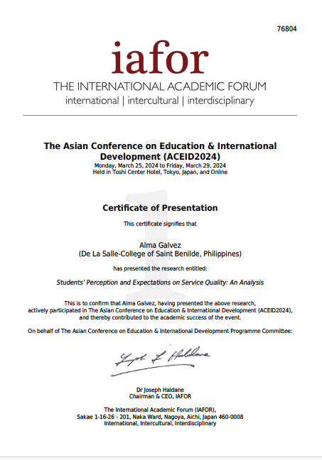 Dr. Alma Galvez and Dr. Marivic Basilio of De La Salle–College of Saint Benilde Antipolo, proudly represented the institution at the Asian Conference on Education and International Development (ACEID 2024) organized by the International Academic Forum (IAFOR). The conference was held from March 25 to 29, 2024, at the Toshi Center Hotel in Tokyo, Japan, with both in-person and online participation.