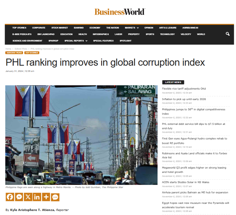 Link to full article: PHL ranking improves in global corruption index – BusinessWorld Online