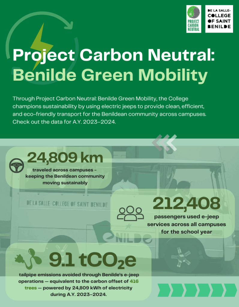Through Project Carbon Neutral: Benilde Green Mobility, the College champions sustainability by utilizing electric jeeps along the streets of Manila to provide clean, efficient, and eco-friendly transportation for the Benildean community across campuses. Check out the data for A.Y. 2023–2024