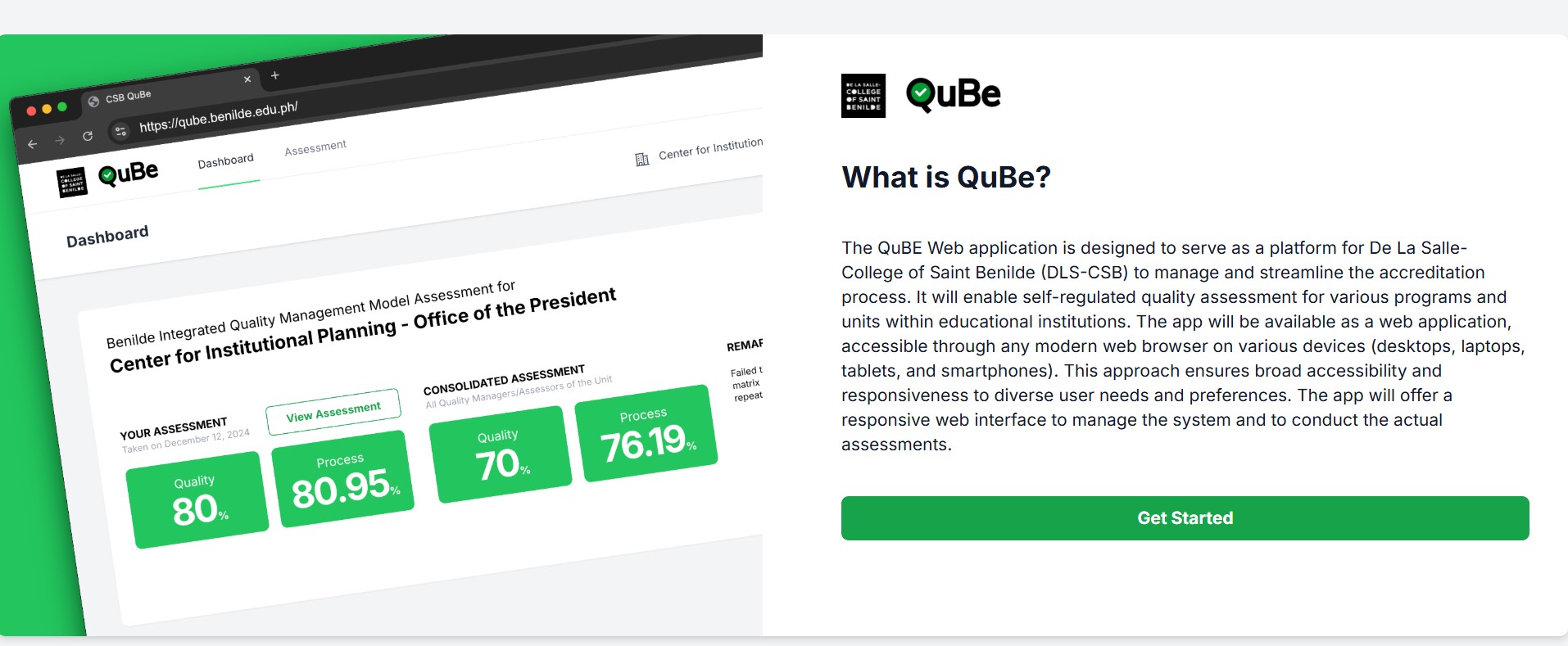 The QuBe innovation project was successfully completed and deployed in the production environment on April 7, 2025. This cutting-edge initiative aims to establish an integrated platform for De La Salle-College of Saint Benilde (DLS-CSB) that aligns with various accreditation standards while promoting continuous improvement and institutional accountability.