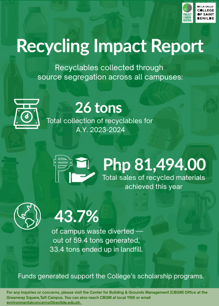 Recyclables collected through source segregation across all Benilde campuses during A.Y. 2023–2024 supported the DLS-CSB Scholarship Program, demonstrating the College’s commitment to sustainability and social responsibility.