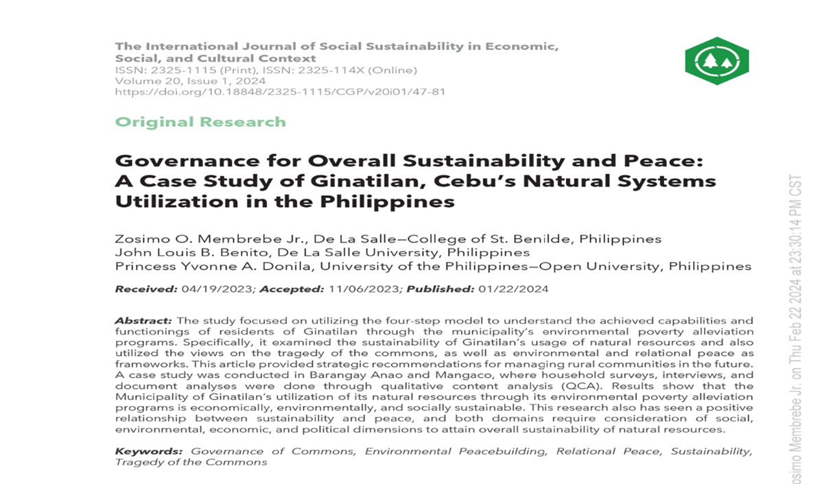 Graduate School Program Coordinator, Dr. Zosimo Membrebe, Jr., is set to publish his research paper titled “Governance for Overall Sustainability and Peace: A Case Study of Ginatilan, Cebu’s Natural Systems Utilization in the Philippines” in The International Journal of Social Sustainability in Economic, Social, and Cultural Context, a Scopus-indexed journal, with a publication date of January 22, 2024.