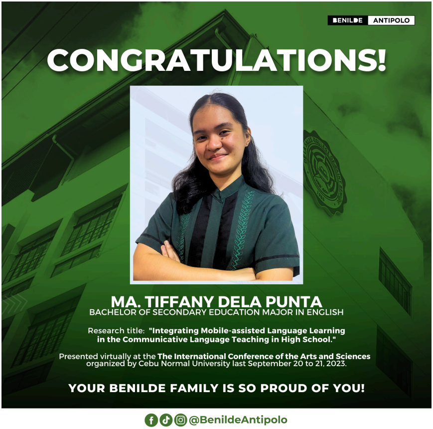 Ma. Tifany Dela Punta, a Teacher Education student, presented her research paper titled “Integrating Mobile-Assisted Language Learning in the Communicative Language Teaching in High School” at the International Conference of the Arts and Sciences, organized by Cebu Normal University. The conference was held on September 20–21, 2023, at Tandang Sora Hall, Cebu Normal University, and via Zoom. Her study highlights the innovative integration of mobile technology to enhance communicative language teaching strategies in secondary education. Her participation exemplifies the program’s dedication to fostering research excellence and promoting evidence-based pedagogical innovations.