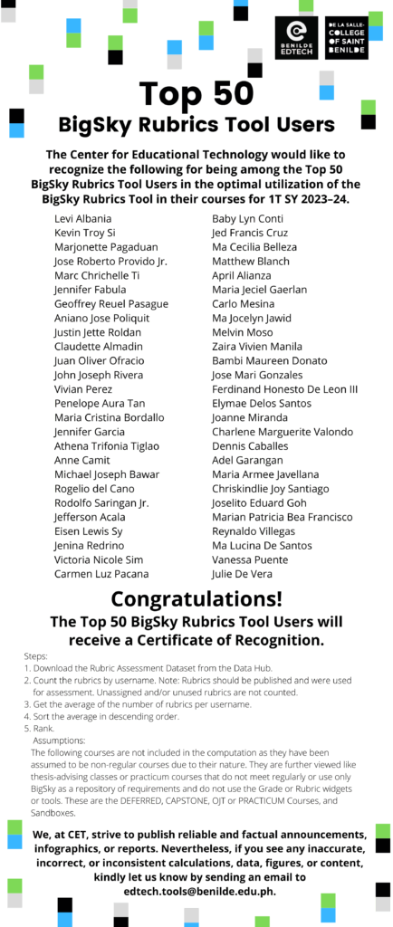 Since the use of Rubrics is part of the Minimum Standards of BigSky Usage, faculty members are required to use the BigSky Rubrics tool in their respective BigSky courses. This recognition will promote the use/optimization of BigSky Rubrics in the teaching and learning process.